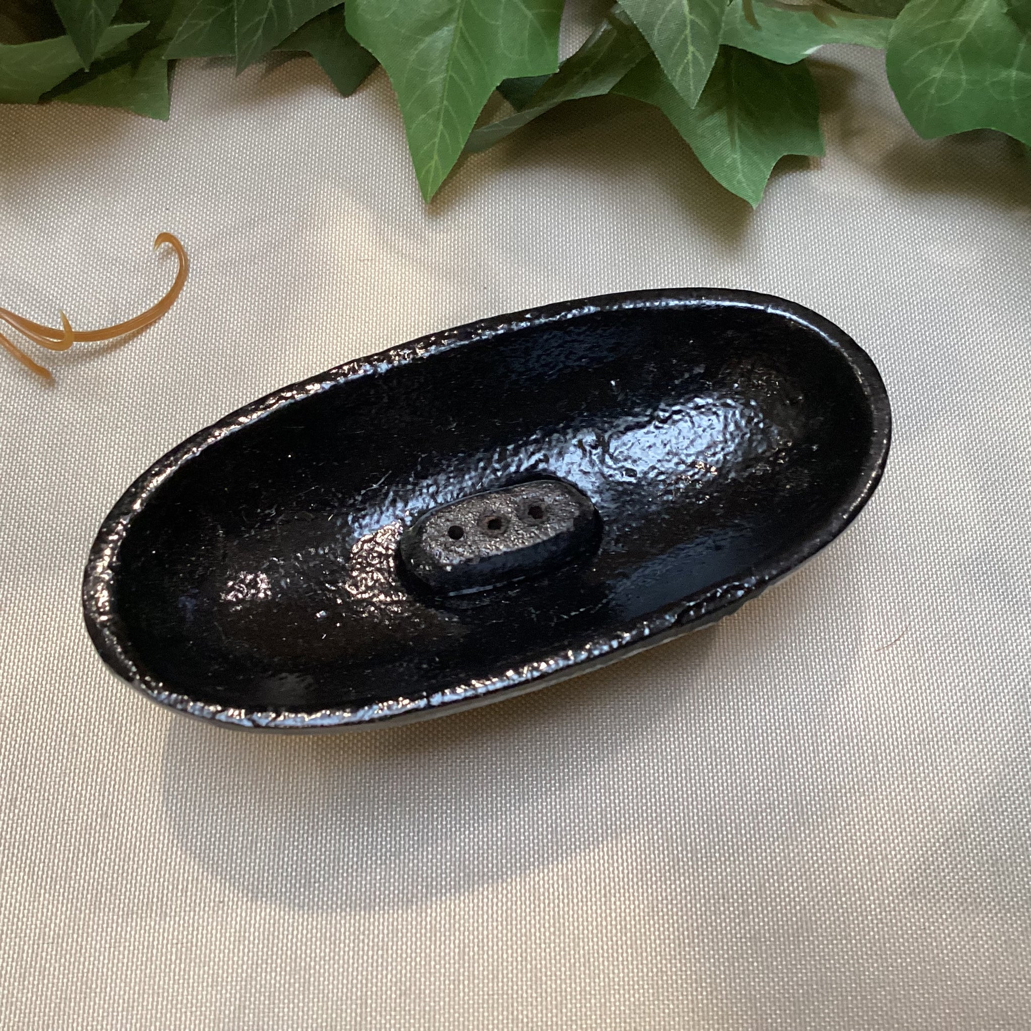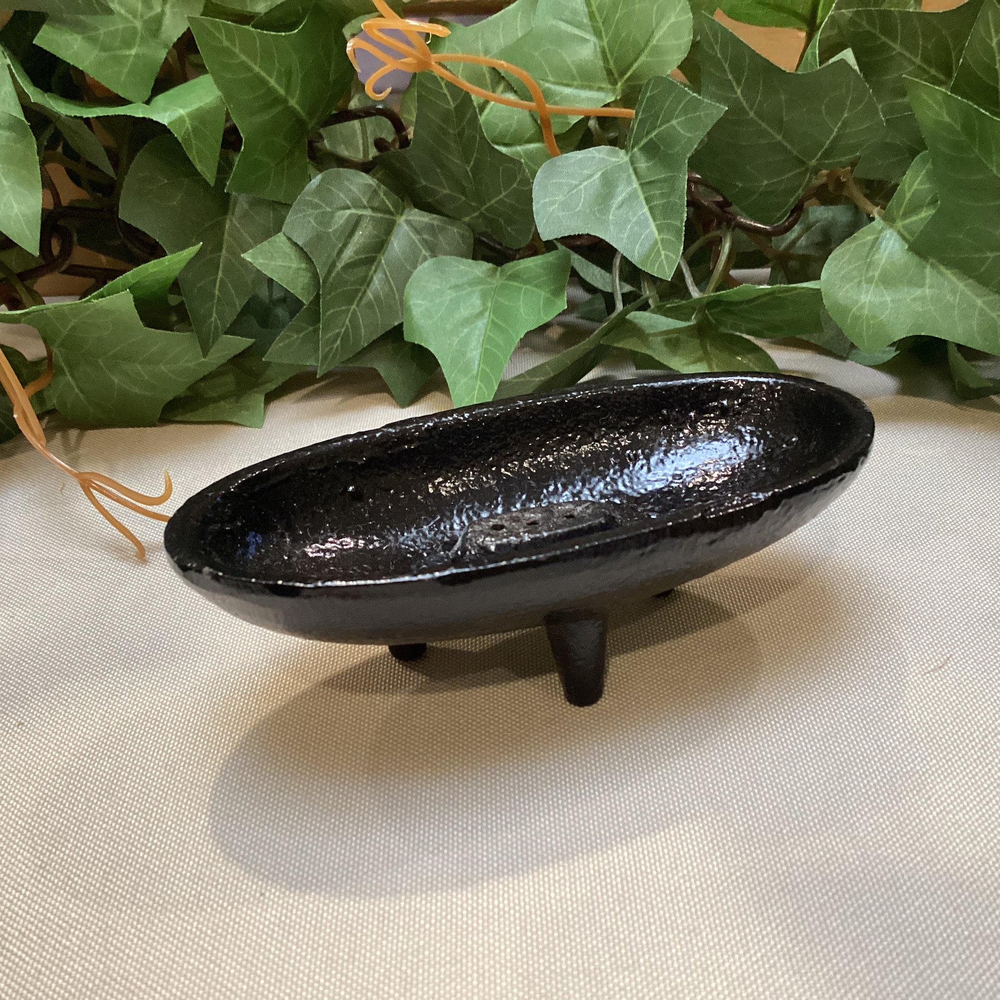 Gloss black finish on cast iron. Use for burning incense sticks in the removable, 3 hold section. You can add a charcoal disc for other style resins or powdered incense. Finish may burn off with items other than stick incense. Add sand to help protect finish if other items are burned. Cast iron.