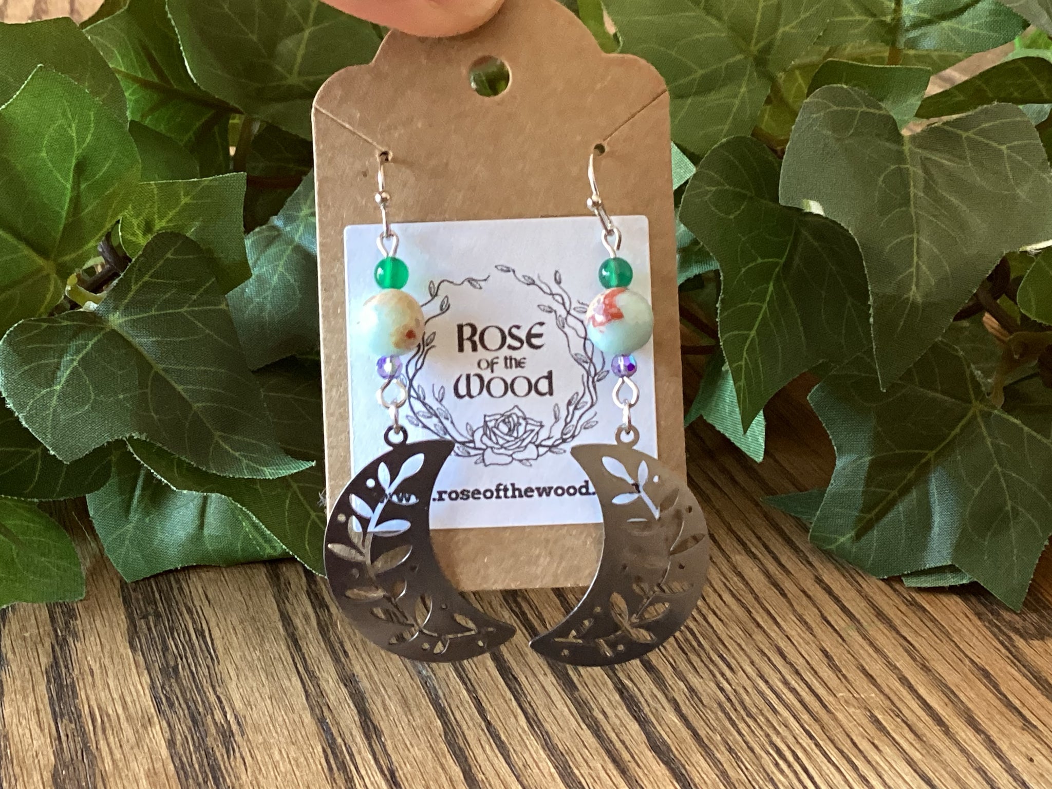 Silver Crescent Moon with leaves Charm~Aqua Terra & Green Onyx Earrings