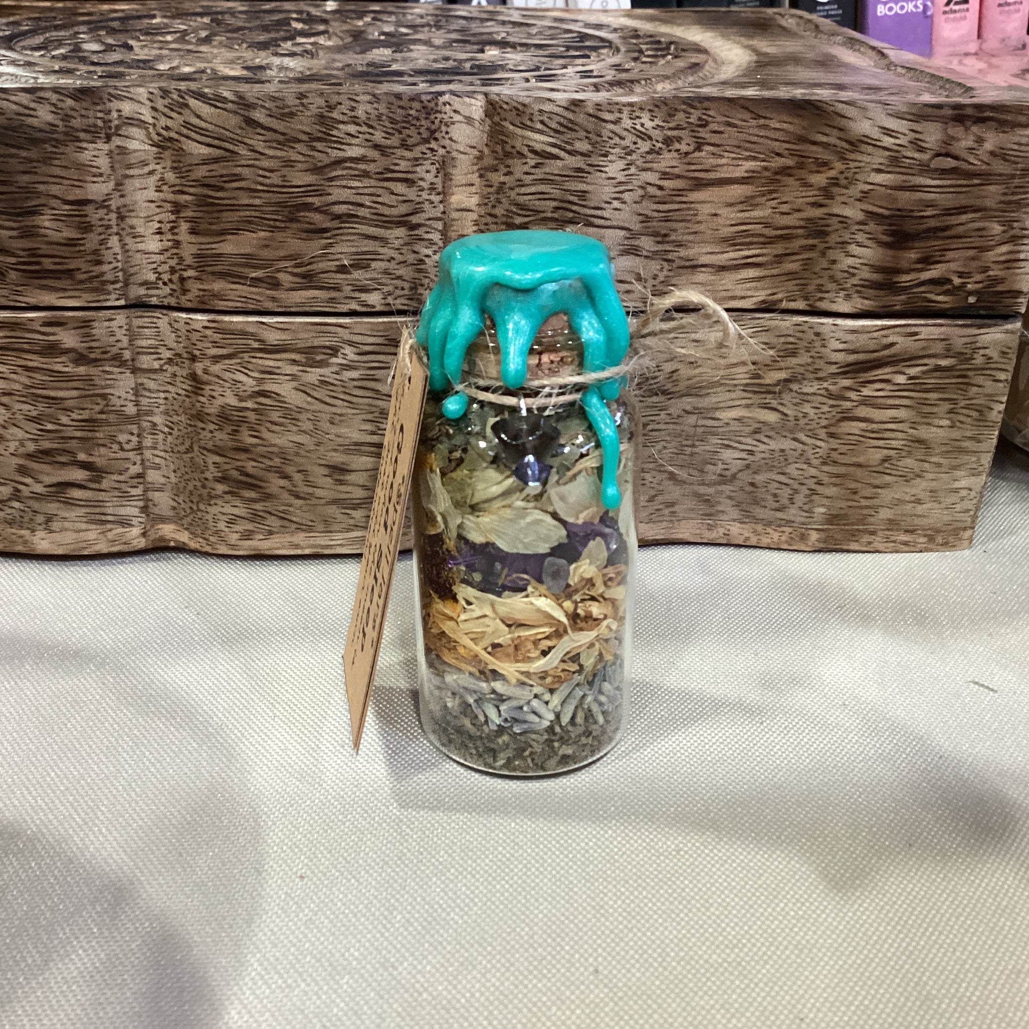 Our spell jars are carefully crafted with a hand selected mix of magickal herbs, salts, spices, resins, and/or stones; that add power to one’s intended desire. Spell charm jars aid in charging and attracting the energy you wish to manifest in your life, you just have to add your own intention!
