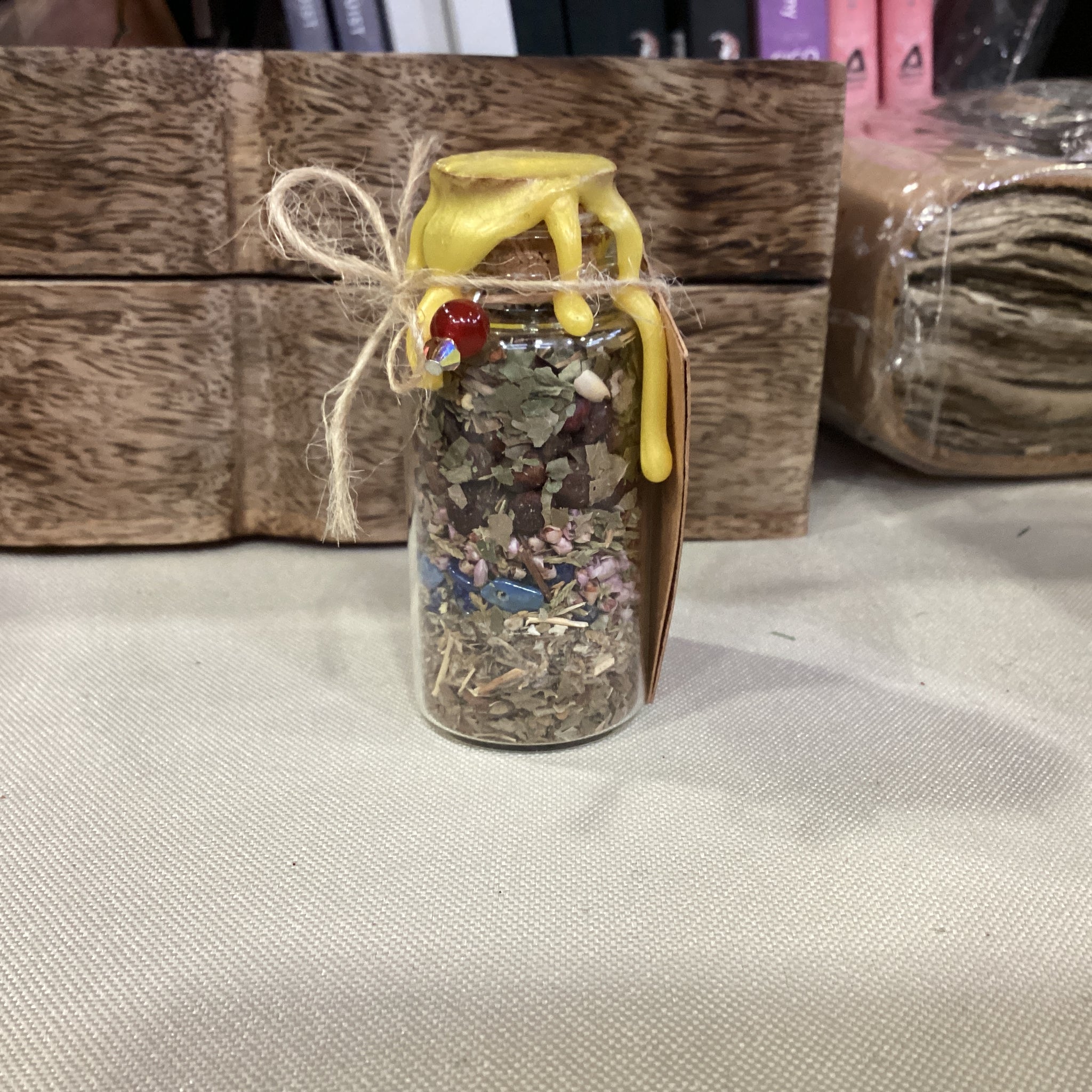 Our spell jars are carefully crafted with a hand selected mix of magickal herbs, salts, spices, resins, and/or stones; that add power to one’s intended desire. Spell charm jars aid in charging and attracting the energy you wish to manifest in your life, you just have to add your own intention!